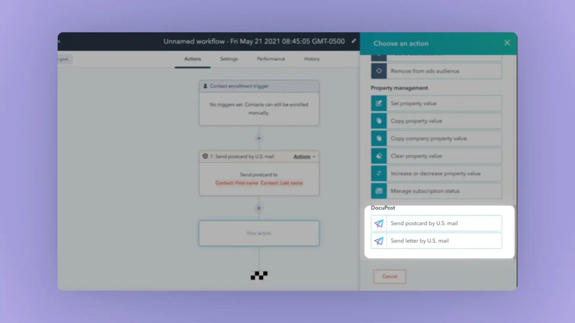 Once you've installed DocuPost on HubSpot, you can access the "Send letter via US Mail" and "Send postcard via US Mail" actions in HubSpot workflows. This allows you to automate sending mail via HubSpot's powerful workflows tool.